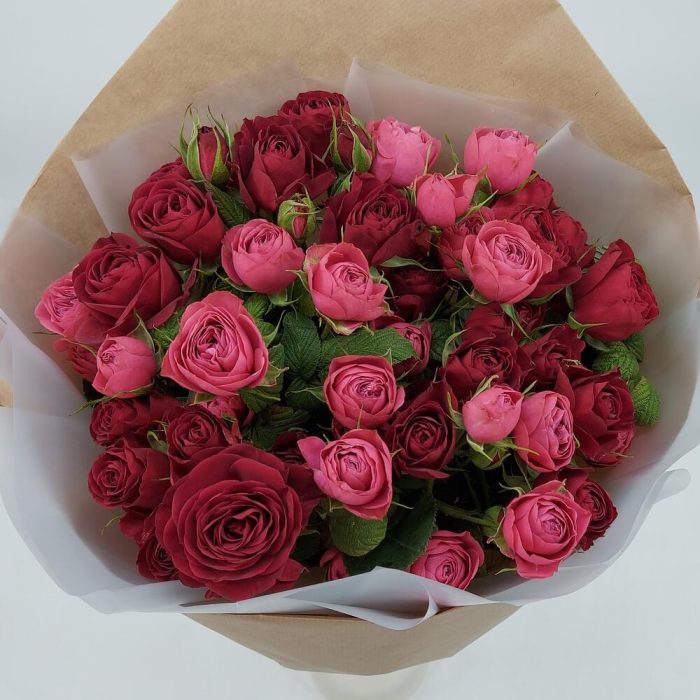 Лента атласная – 2 шт.Упаковка пленка матовая – 1 шт.Упаковка крафт – 1 шт.роза кустовая премиум – 9 шт.