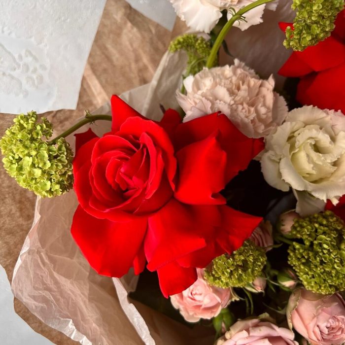 Роза – 4 шт.Вибурнум – 2 шт.Гвоздика – 2 шт.Лизиантус – 1 шт.Авторская упаковка – 1 шт.