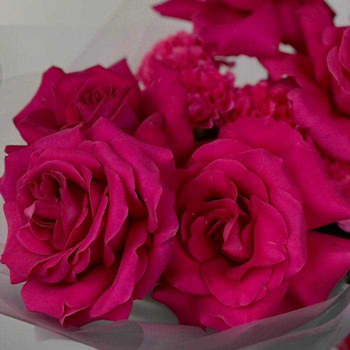 Множество малиновых оттенков в одном букете.Ароматные Розы Пинк Флойд в перемешку с гвоздиками и пушистым лагурусом. Мы используем для создания наших букетиков только качественный и свежий цветок Создаем букеты с невероятной любовью К букетику мы всегда прилагаем подкормку для цветочков – «chrysal”, чтобы они дольше сохраняли свою свежесть и красоту а также «Советы флористов» по уходу за срезанными цветочками Дополнительно к букетику Вы можете приобрести аквабоксы, транспортировочные коробки, крафтовые пакеты и вазы нужного размера