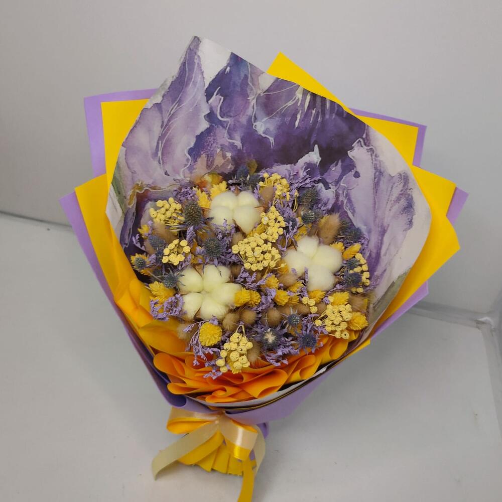 Хлопок – 3 шт.сухоцветы в ассортименте – 20 шт.Дизайнерская упаковка – 1 шт.