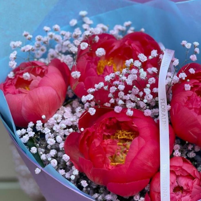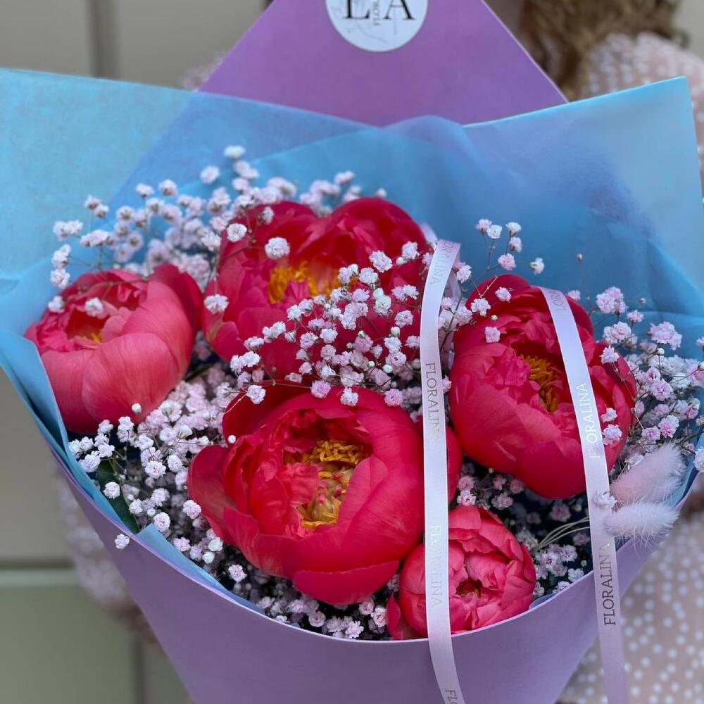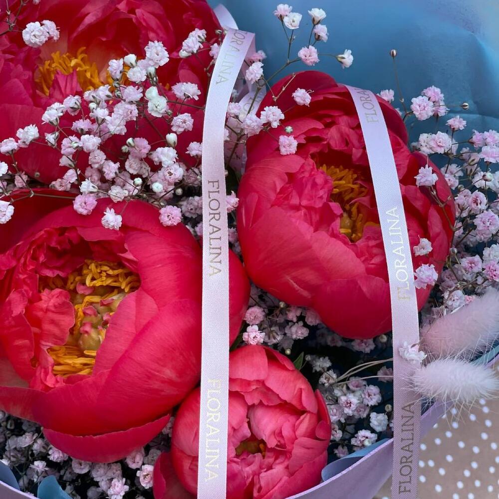 Гипсофила – 5 шт.Пион Коралл Шарм (Coral Charm) – 5 шт.Лента атласная – 1 шт.Тишью – 2 шт.Лента брендированная – 1 шт.Лагурус (сухоцвет) – 6 шт.фламиран упаковка – 1 шт.