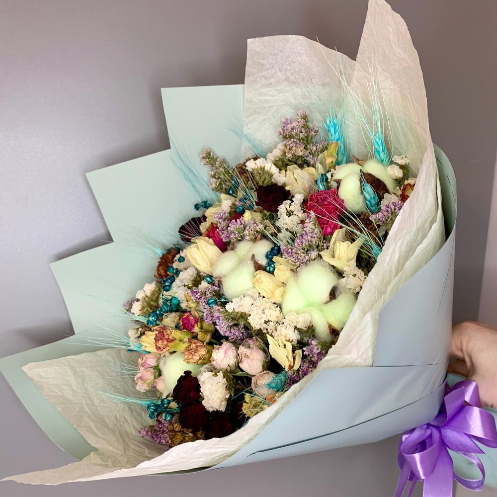 Хлопок – 5 шт.Лента атласная – 3 шт.Тишью – 1 шт.Сухоцветы – 40 шт.Тритикум(пшеница) – 15 шт.Дизайнерская упаковка – 2 шт.лимониум сухоцвет – 15 шт.статица сухоцвет – 9 шт.абрус сухоцвет – 20 шт.