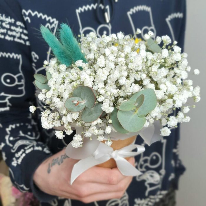 Композиция из белой гибсофилы и эвкалипта