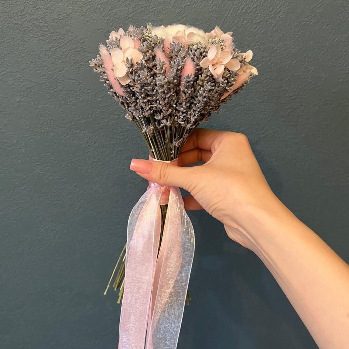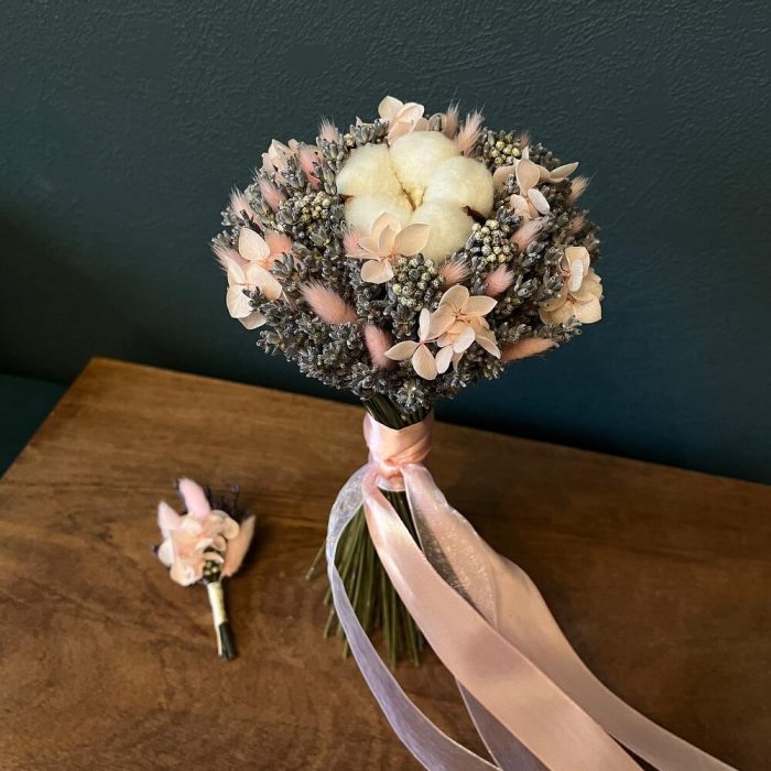 лавандин сухоцвет – 1 шт.Хлопок натуральный – 1 шт.Лагурус (сухоцвет) – 20 шт.гортензия стабилизированная – 5 шт.озотамнус стабилизированный – 5 шт.