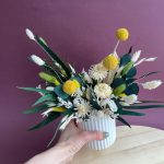 Краспедия желтая – 3 шт.Эвкалипт стабилизированный – 15 шт.Бессмертник – 3 шт.Лагурус – 9 шт.фаларис сухоцвет – 7 шт.озотамнус стабилизированный – 9 шт.