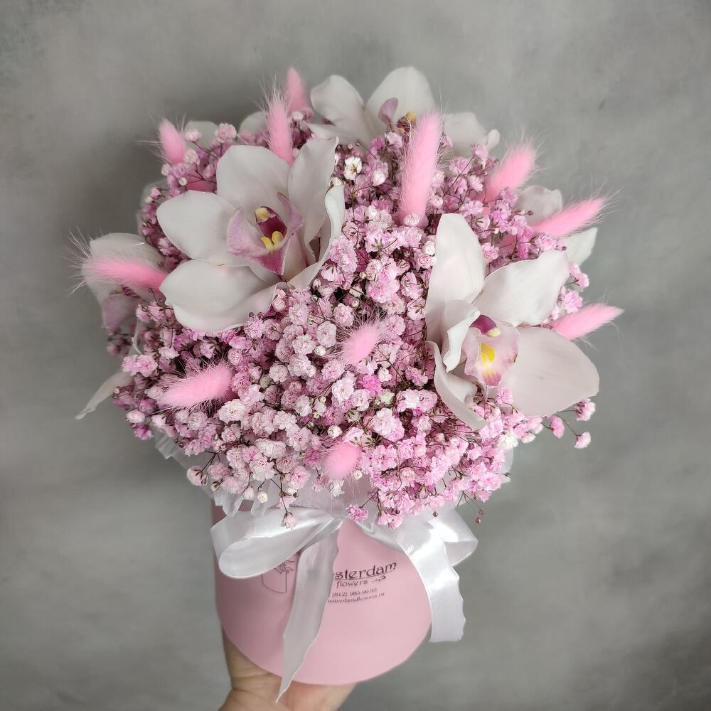 Орхидея Цимбидиум – 7 шт.Гипсофила – 7 шт.Лагурус – 15 шт.Коробка шляпная – 1 шт.Оазис флористический – 2 шт.