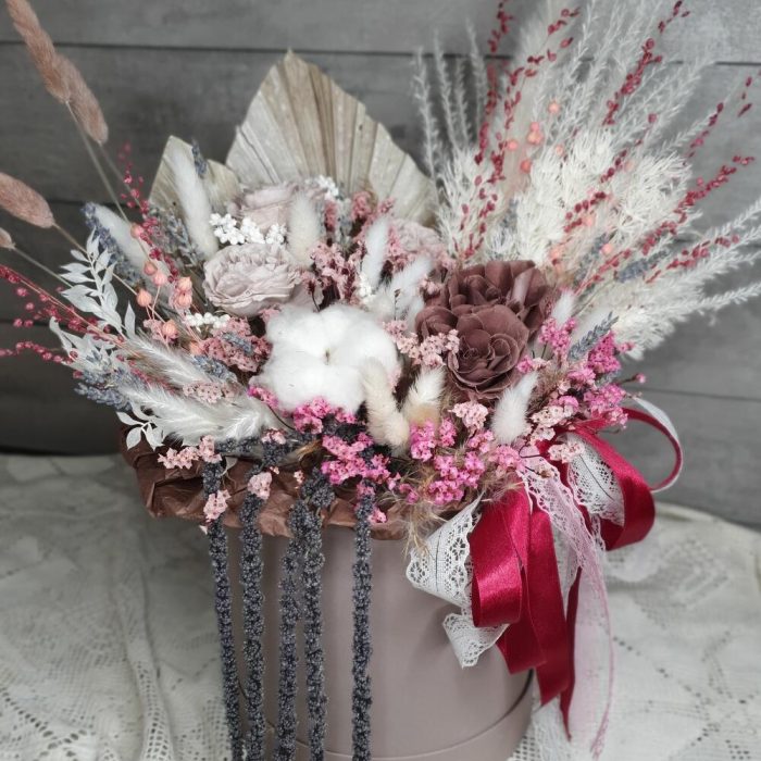 стабилизированные розы – 5 шт.аурея белая – 2 шт.Хлопок натуральный – 1 шт.Лагурус – 16 шт.лен сухоцвет – 3 шт.бриза пучок – 2 шт.копье пальмы – 1 шт.амарант стабилизированный – 5 шт.статица стабилизированная – 9 шт.рускус стабилизированный выбеленный – 1 шт.сорго – 3 шт.лавандин пучок – 1 шт.аспарагус стабилизированный выбеленный – 1 шт.Шляпная коробка – 1 шт.Лента – 2 шт.Тишью – 1 шт.