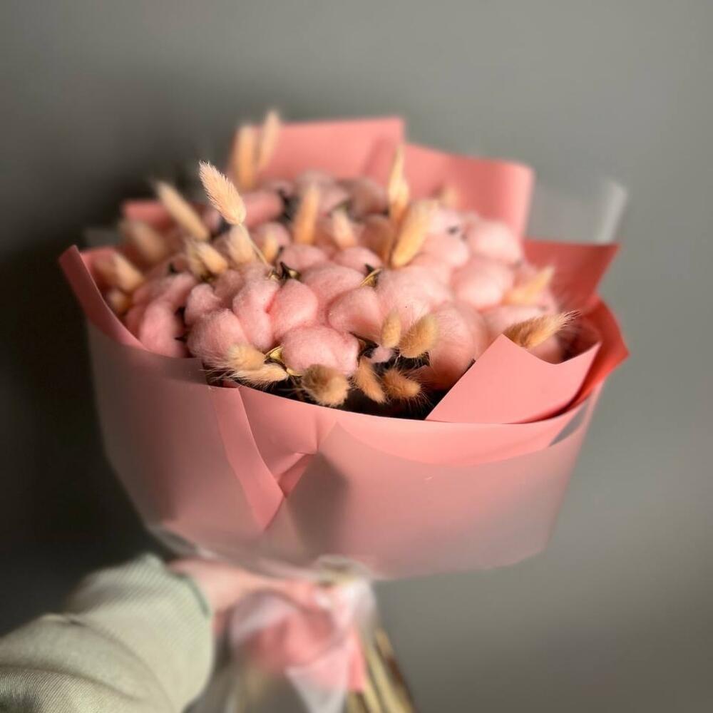 Хлопок натуральный – 15 шт.Лагурус (сухоцвет) – 40 шт.Упаковка дизайнерская – 5 шт.Лента атласная – 1 шт.
