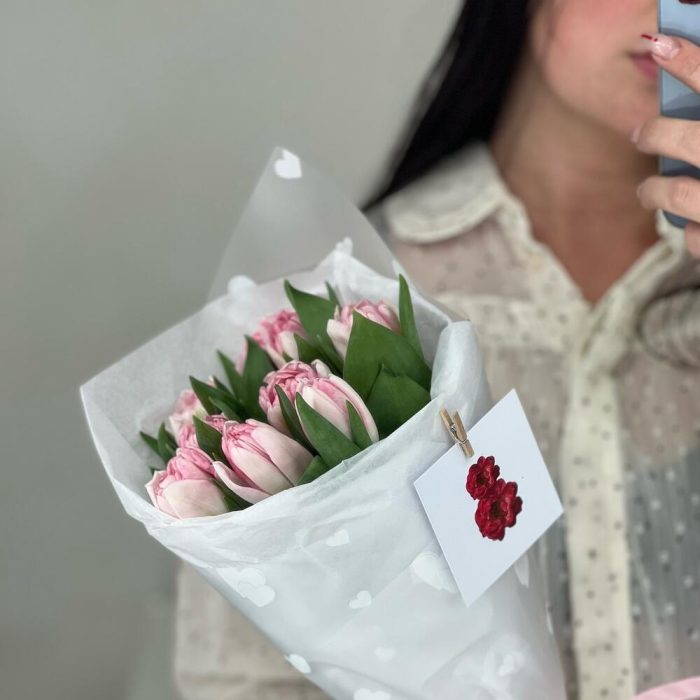 Упаковка – 2 шт.Лента атласная – 1 шт.Открытка – 1 шт.Тюльпан пионовидный – 9 шт.