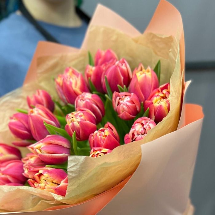 Тюльпан пионовидный – 25 шт.Тишью – 2 шт.Пленка матовая – 3 шт.Лента атласная – 2 шт.