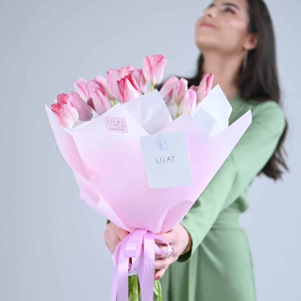 Тюльпан – 15 шт. Упаковка дизайнерская – 1 шт. Открыточка с вашими пожеланиями – 1 шт. инструкция по уходу за цветами – 1 шт.