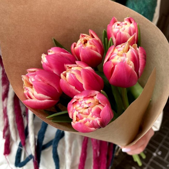 Крафт упаковка – 1 шт.тюльпан пионовидные красные – 7 шт.